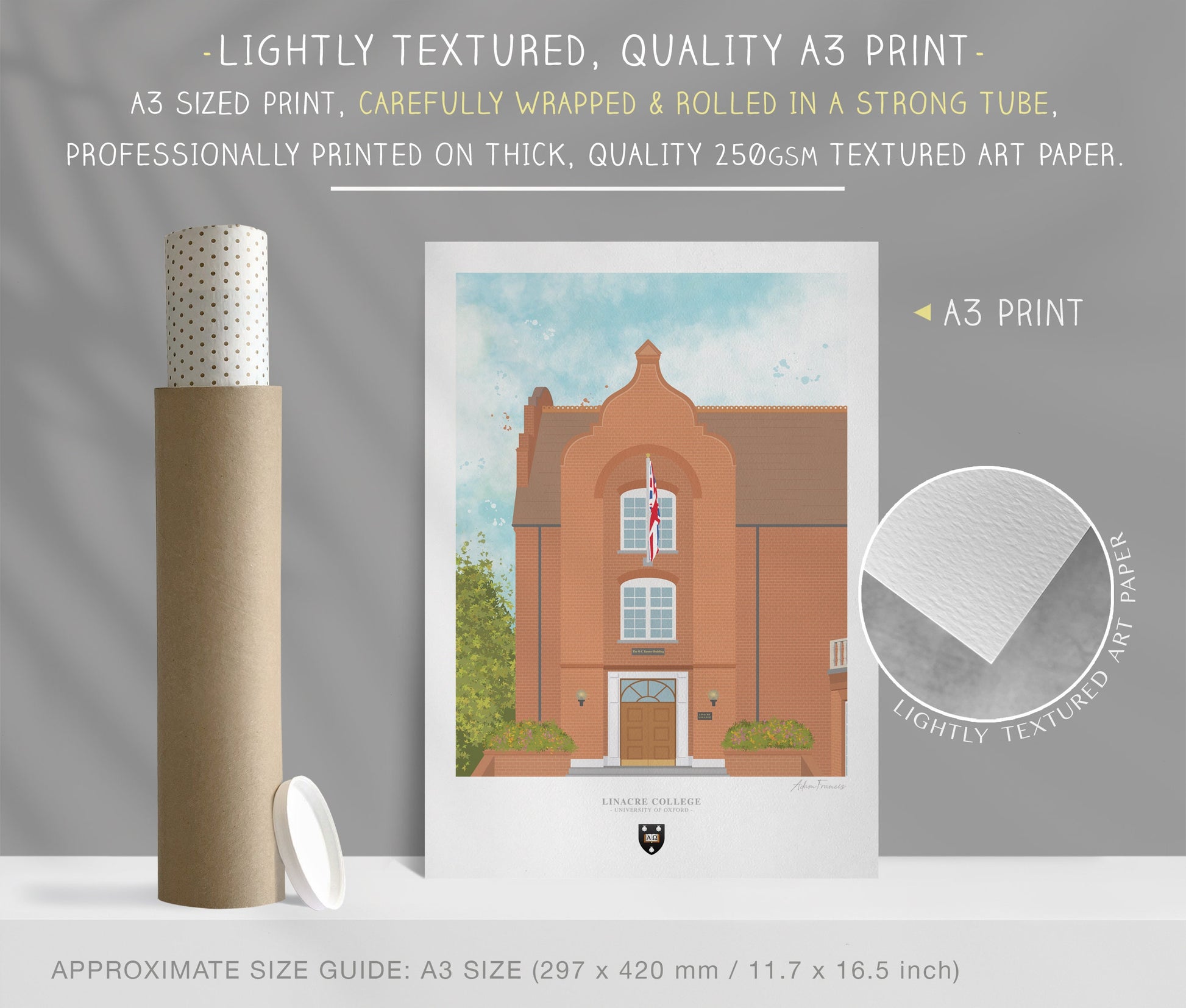 ‣ A3 sized ROLLED art print: 250gsm art paper | Carefully ROLLED in tissue paper | Posted in a Secure Tube